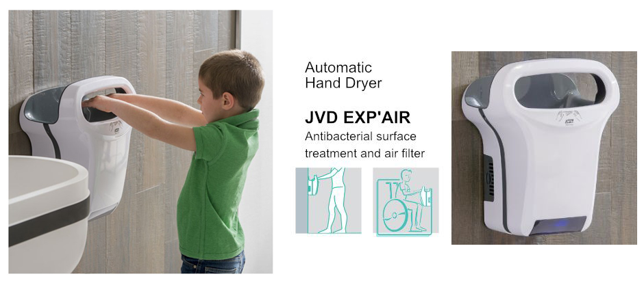 A JVD Copt'air nagysebességű kézszárítója, köszönhetően a szabadalmaztatott forgó levegő fúvókának köszönhetően, a 450 km/h sebességgel kiáramló forgó levegőáram hatékony és gyors kézszárítást tesz lehetővé. Az öntött alumínium burkolatnak köszönhetően az automata kézszárító vandálbiztos, vandalizmusnak, a szándékos rongálásnak ellenálló konstrukció.